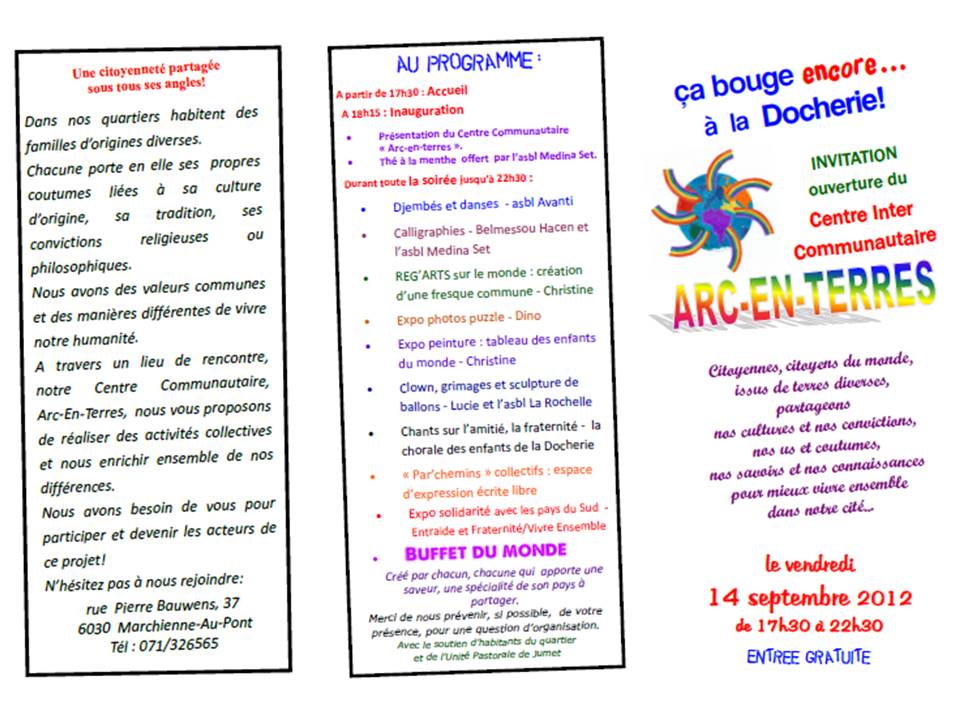 C’est dès septembre 2012, que notre Unité Pastorale a soutenu, autour de la maison des sœurs et avec sœur Anne Marie Blondieau comme permanente, un beau projet interculturel et interreligieux dans le quartier de la Docherie. C’est ainsi qu’est née l’association Arc-en-Terres.