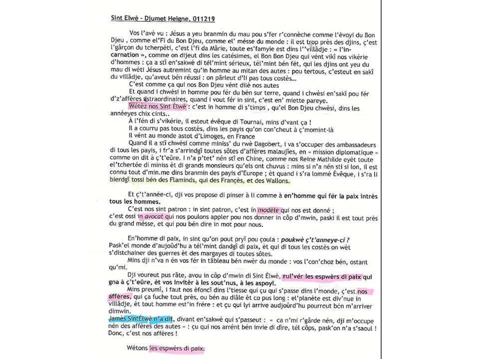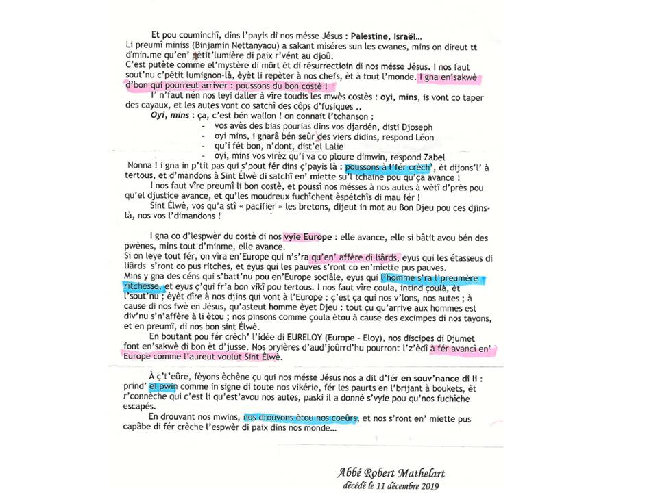 Chers Amis, en cette belle période de Noël, nous portons à votre connaissance une copie de l’Homélie rédigée par notre Ami l’Abbé Robert Mathelart pour la Messe en wallon et le 100ème Anniversaire des Disciples de Saint Eloi de Jumet Heigne.