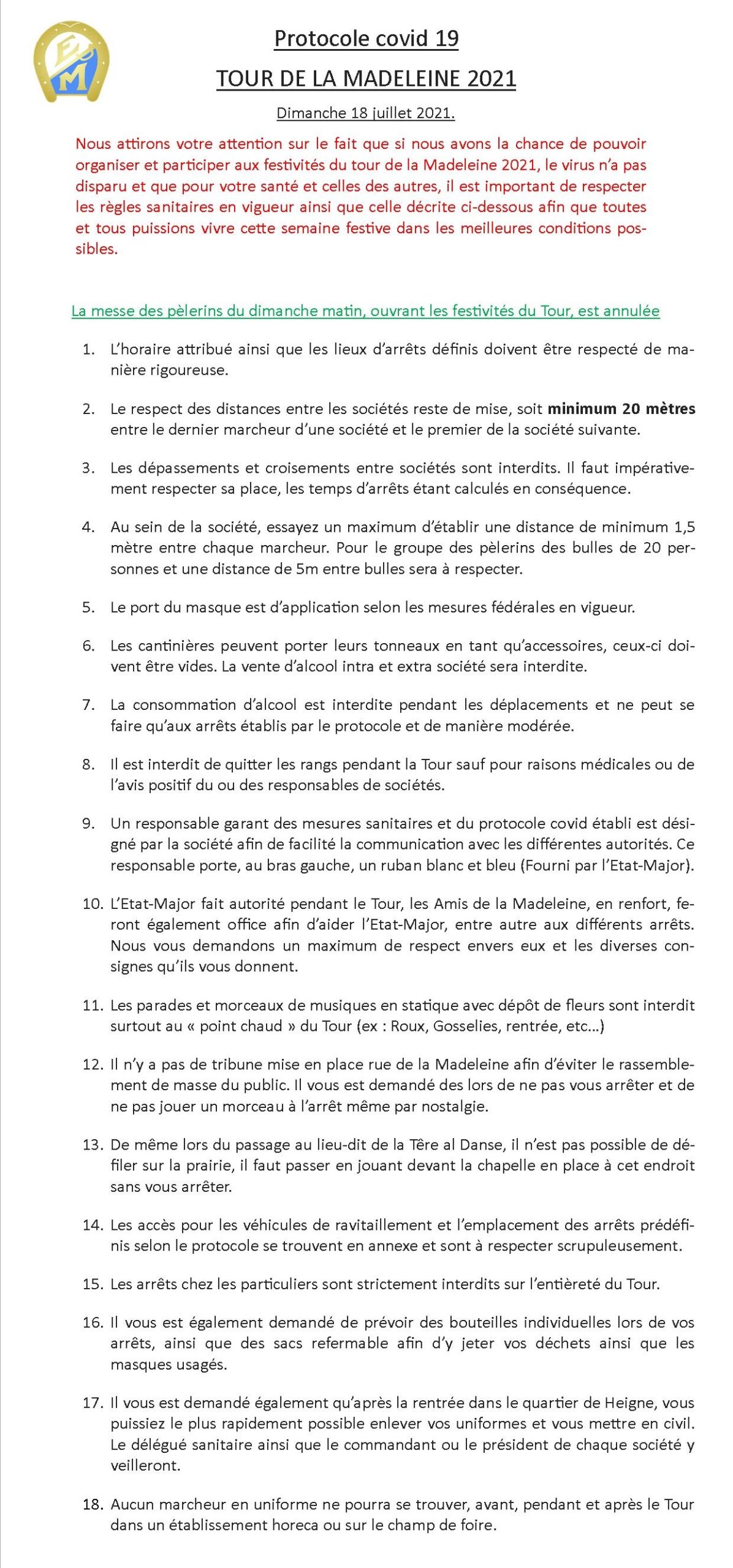 Voici le protocole Covid 19 pour cette marche de la Madeleine 2021.