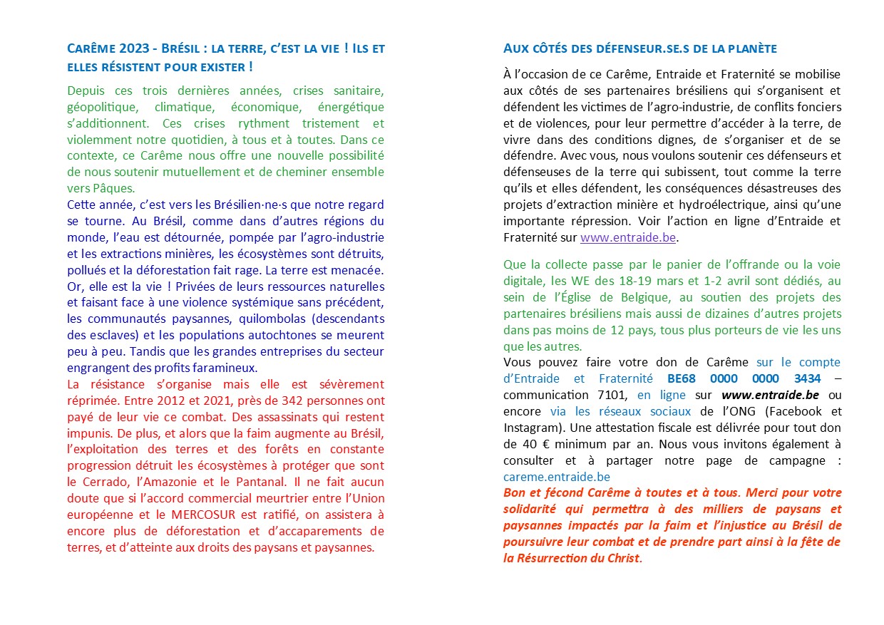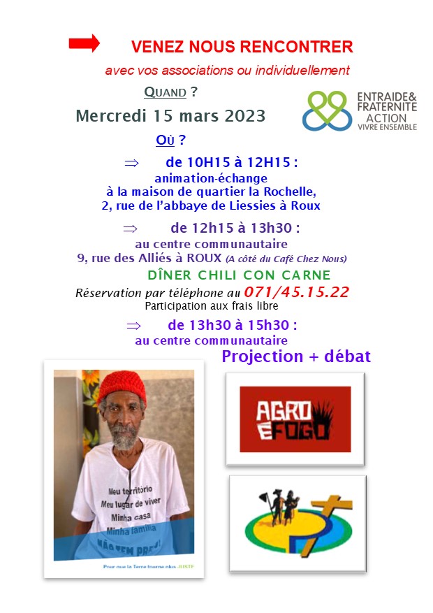 Campagne de Carême : un témoin venant du Brésil vient à notre rencontre à Roux 22 février 2023 Claudio Marini A ne pas manquer 0Invitation à imprimer en PDF : invitation rencontre Entraide et Fraternité Roux 15 03 2023Partager : Partager sur X(ouvre dans une nouvelle fenêtre) X Partager sur Facebook(ouvre dans une nouvelle fenêtre) Facebook