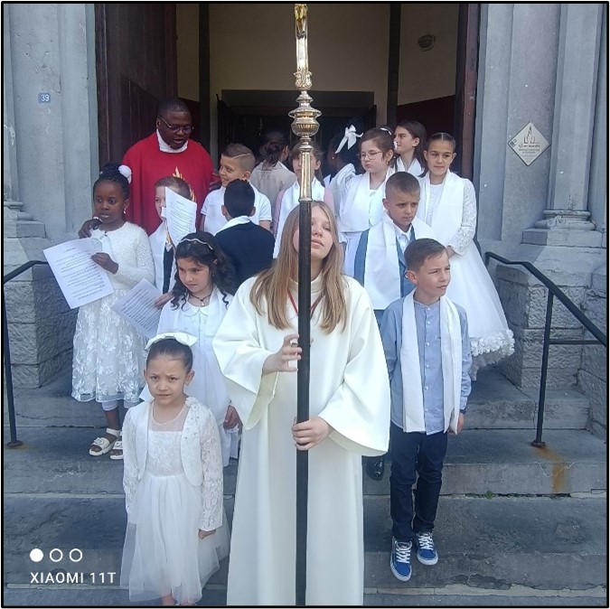 Le lendemain, dimanche 28 mai, c’est l’abbé Phalère Massengo, ayant reçu la mission de l’évêque, qui a confirmé les 12 autres dans l’église de Jumet Gohyssart, l’Immaculée Conception. 7 d’entre eux ont aussi reçu le sacrement d’Eucharistie pour la première fois. 2 enfants de catéchisme de 1ère année ont aussi reçu le sacrement d’Eucharistie car ils accompagnaient leur frère et sœur.