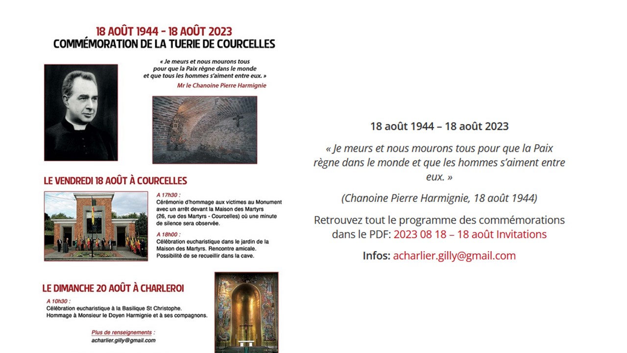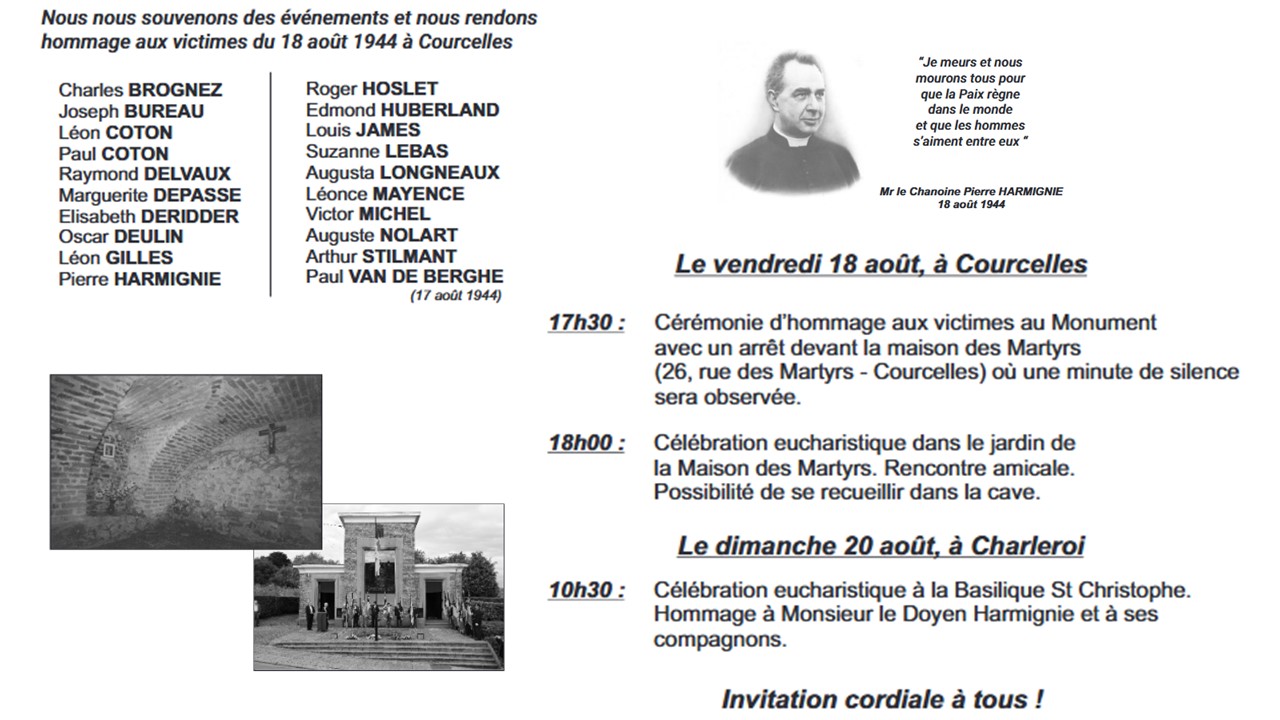 Comme chaque année, nous sommes invités à faire devoir de mémoire en nous rappelant que des personnes ont donné leur vie durant la seconde guerre mondiale pour que règne la paix dans nos contrées et en Europe. N’hésitons pas à marquer de notre présence cette manifestation, le vendredi 18 août ou à participer à l’eucharistie en union avec toutes les victimes le dimanche 20 aout à 10h30.