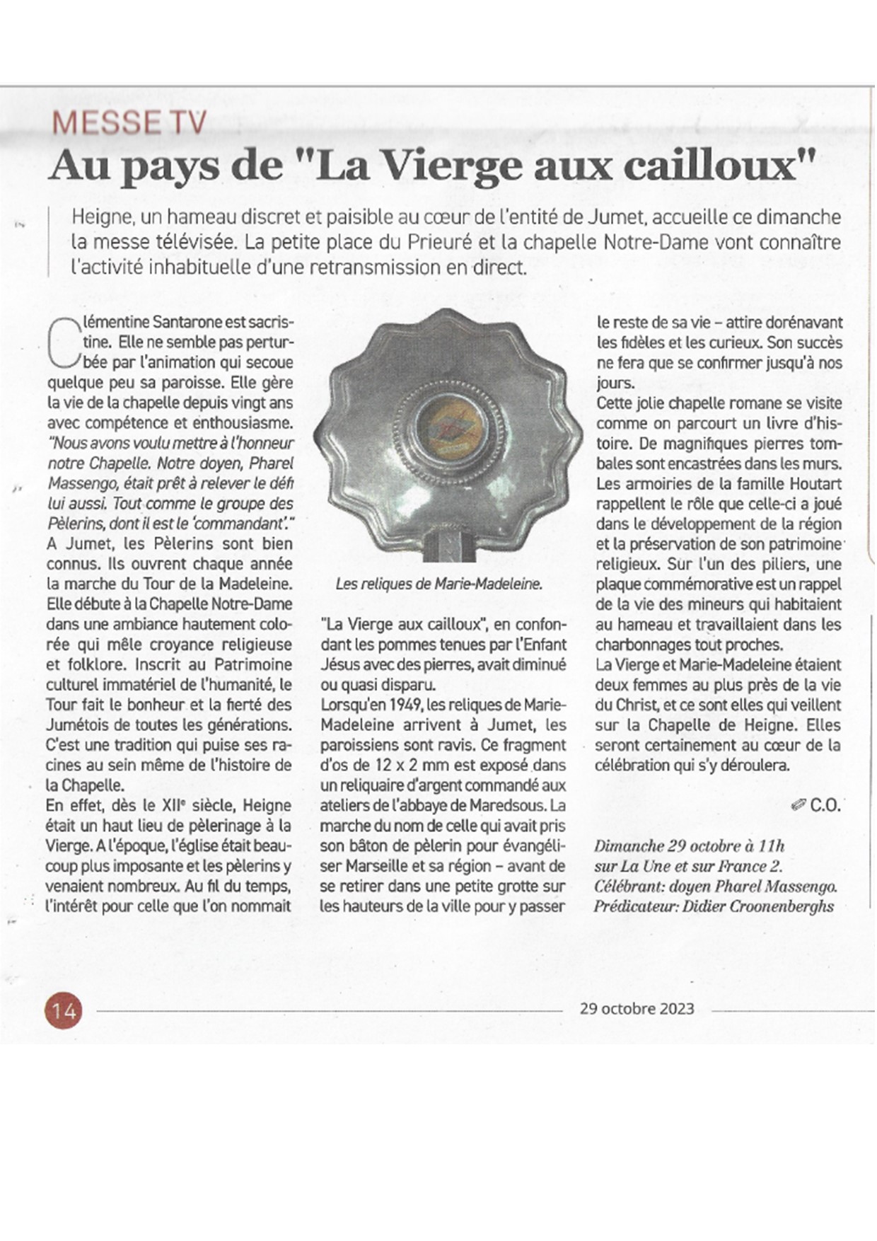 Une messe télévisée à Jumet Heigne ce dimanche 29 octobre 2023 27 octobre 2023 Claudio Marini A ne pas manquer 0Partager : Cliquer pour partager sur X(ouvre dans une nouvelle fenêtre) X Cliquez pour partager sur Facebook(ouvre dans une nouvelle fenêtre) Facebook