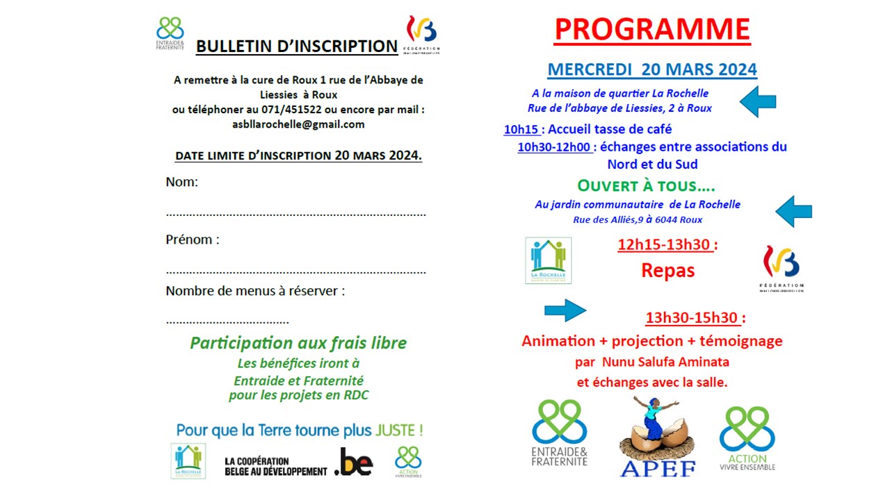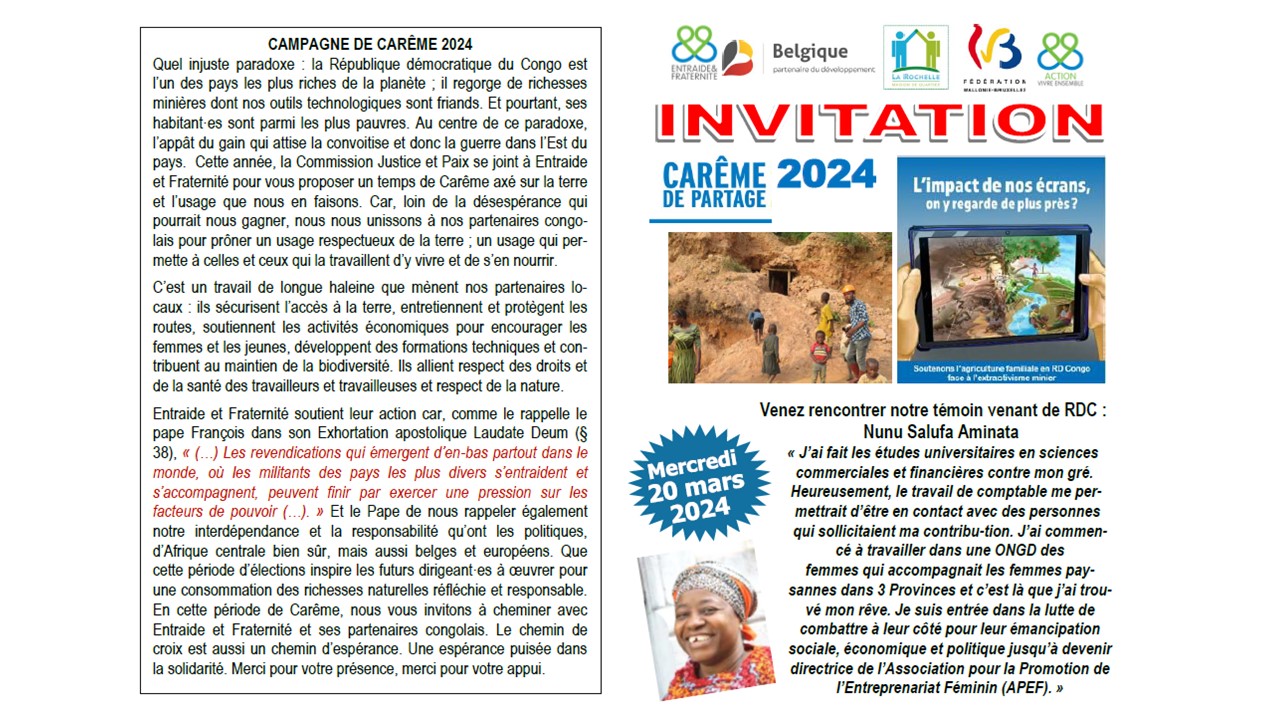 Invitation pour le carême de partage : rencontre d’échange à Roux avec Entraide et Fraternité 21 février 2024 Claudio Marini A ne pas manquer 0Affiche rencontre 20 mars 2024 EF témoin carême de partagePartager : Partager sur X(ouvre dans une nouvelle fenêtre) X Partager sur Facebook(ouvre dans une nouvelle fenêtre) Facebook