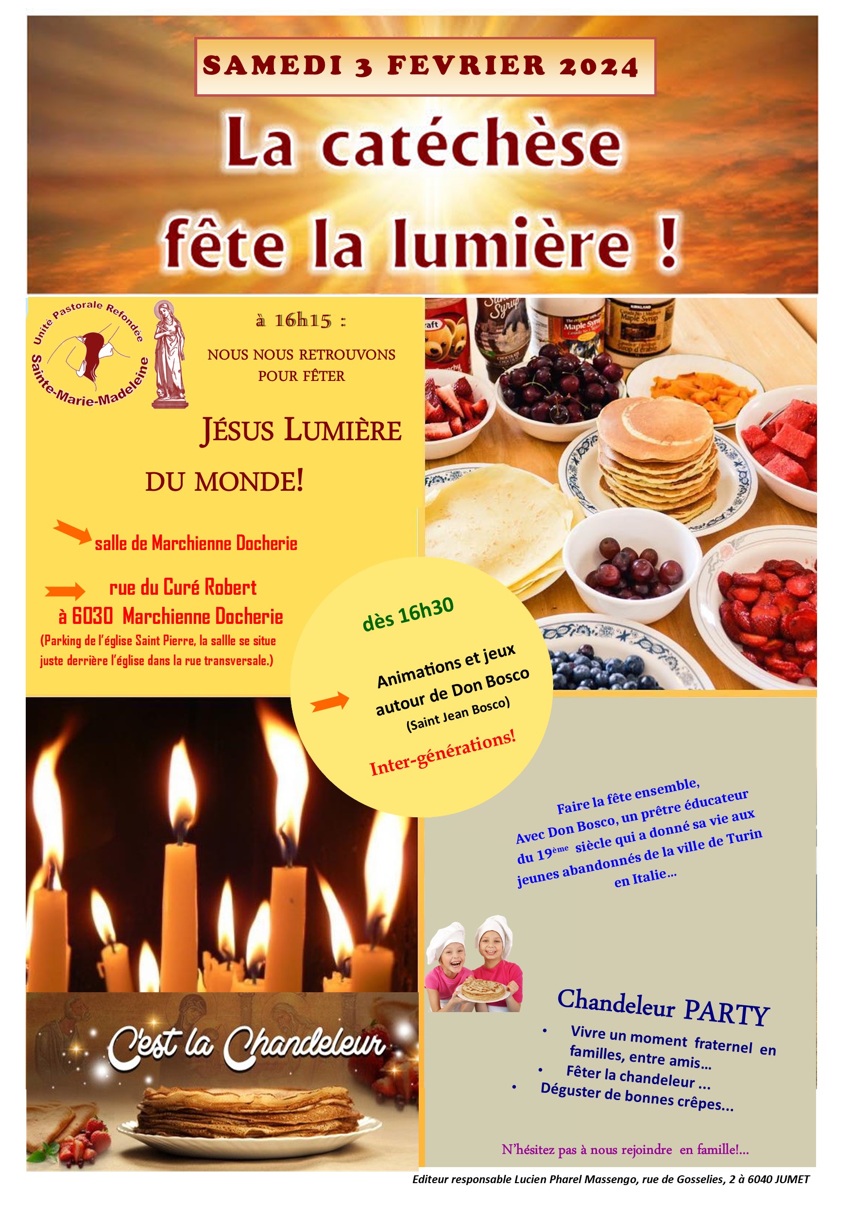 Ce samedi 3 février 2024, les enfants du catéchisme, leurs parents, les catéchumènes, les catéchistes et quelques paroissiens se sont retrouvés dans la salle paroissiale Saint Louis de Marchienne Docherie pour célébrer la Chandeleur.
