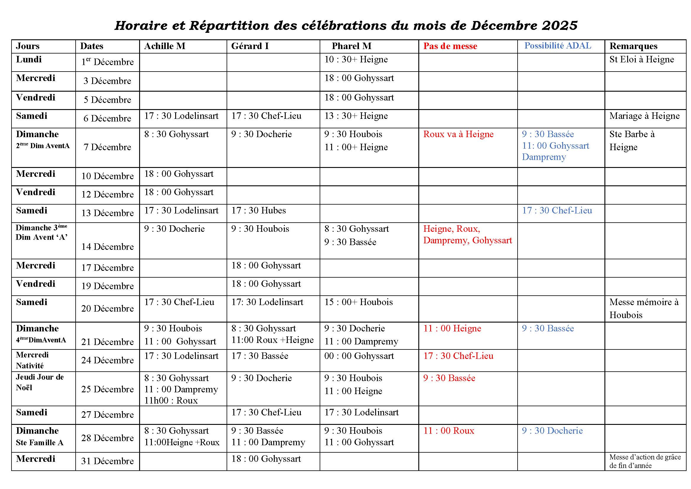 Horaire et Répartition des célébrations du mois de Novembre 2025