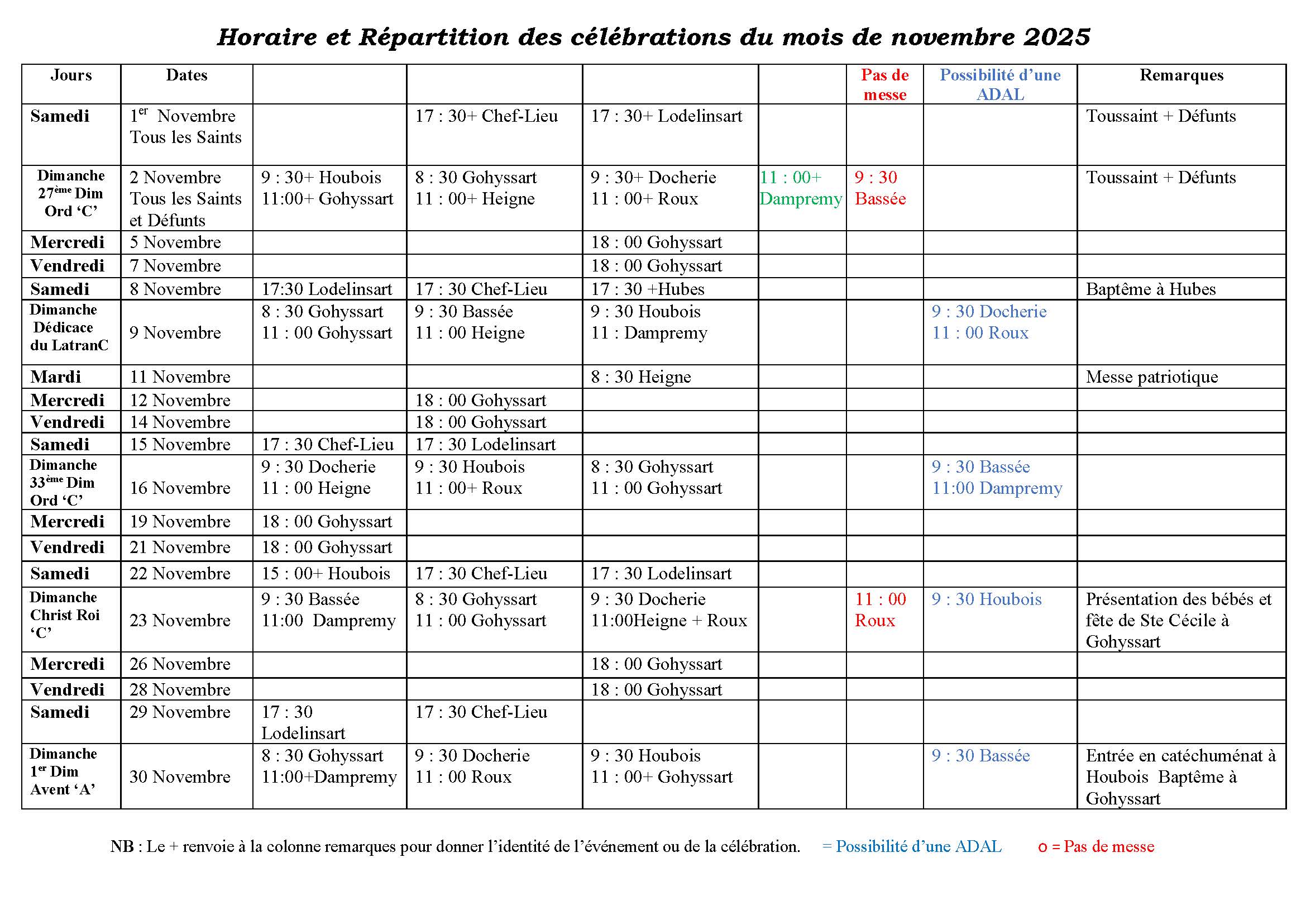 Horaire et Répartition des célébrations du mois de NOVEMBRE 2025
