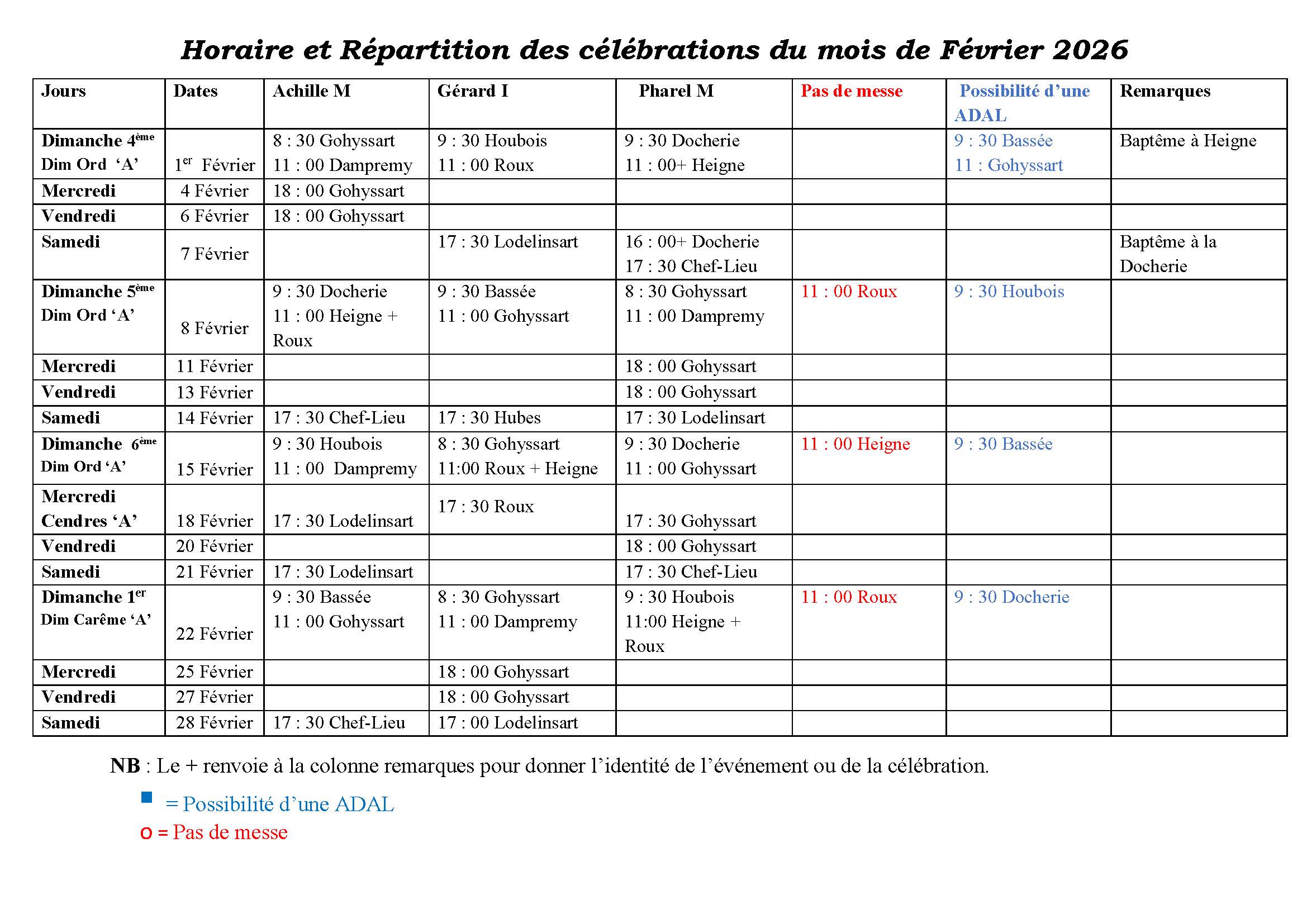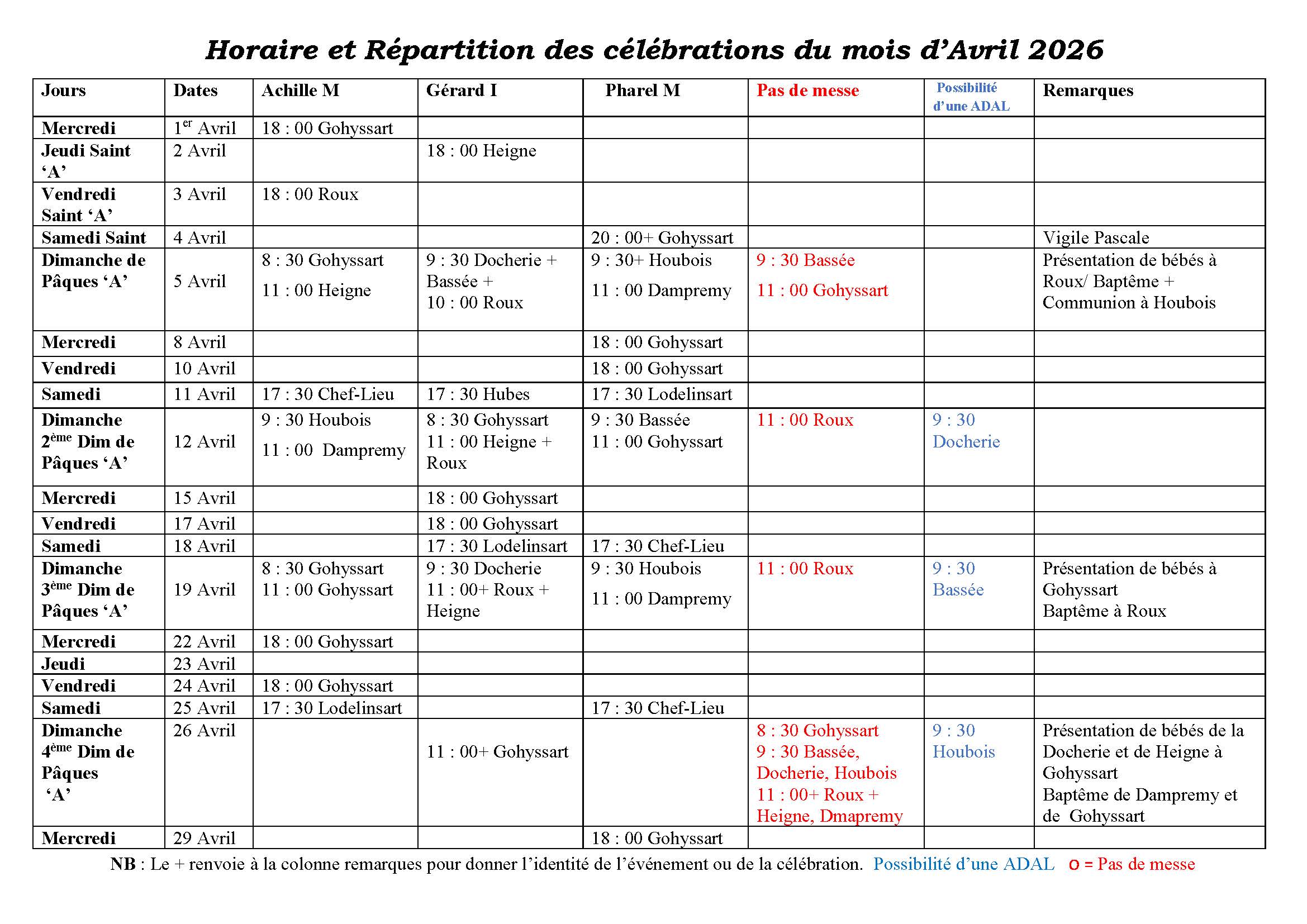 Horaire et Répartition des célébrations du mois de AVRIL 2026
