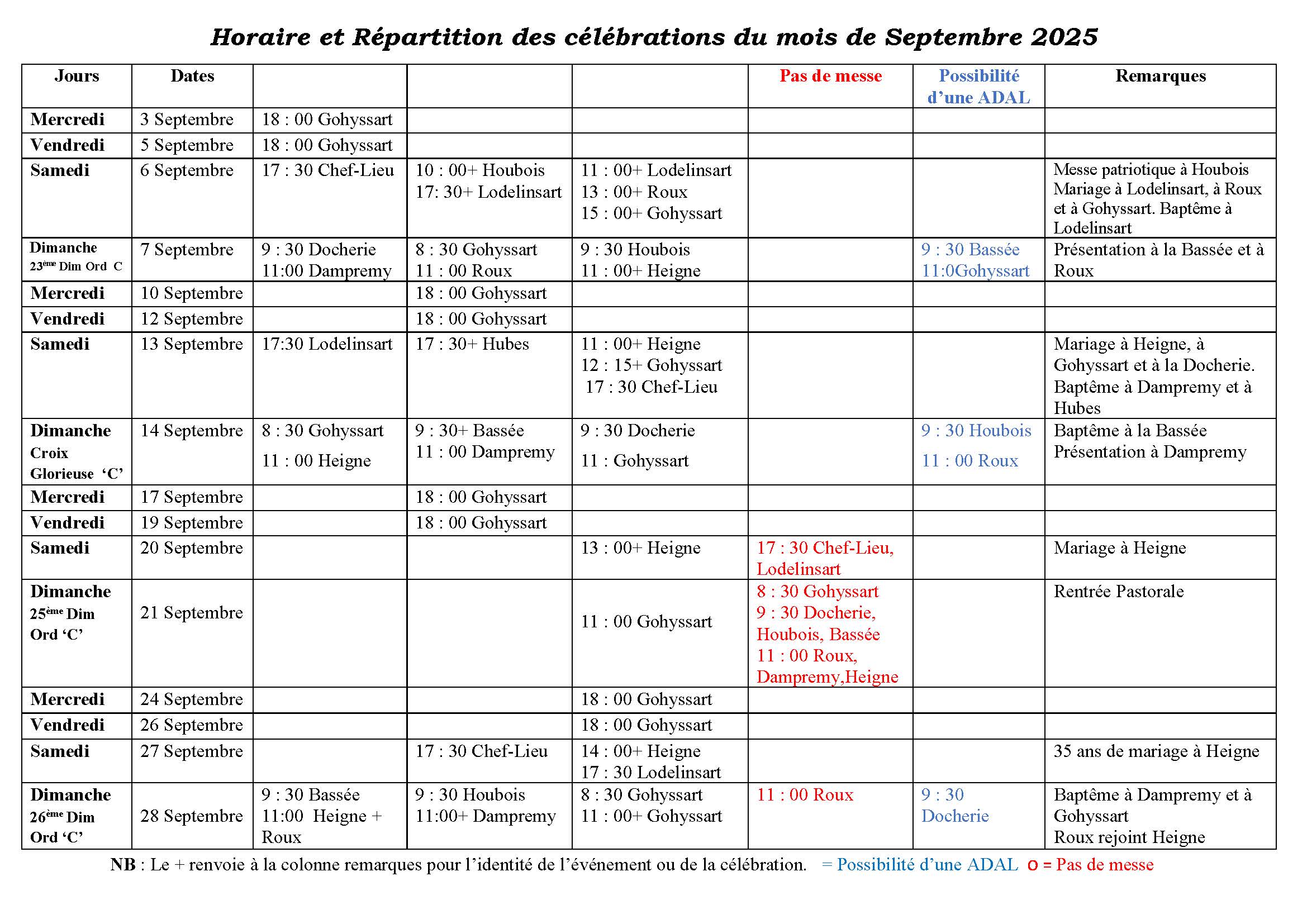 Horaire et Répartition des célébrations du mois de SEPTEMBRE 2025