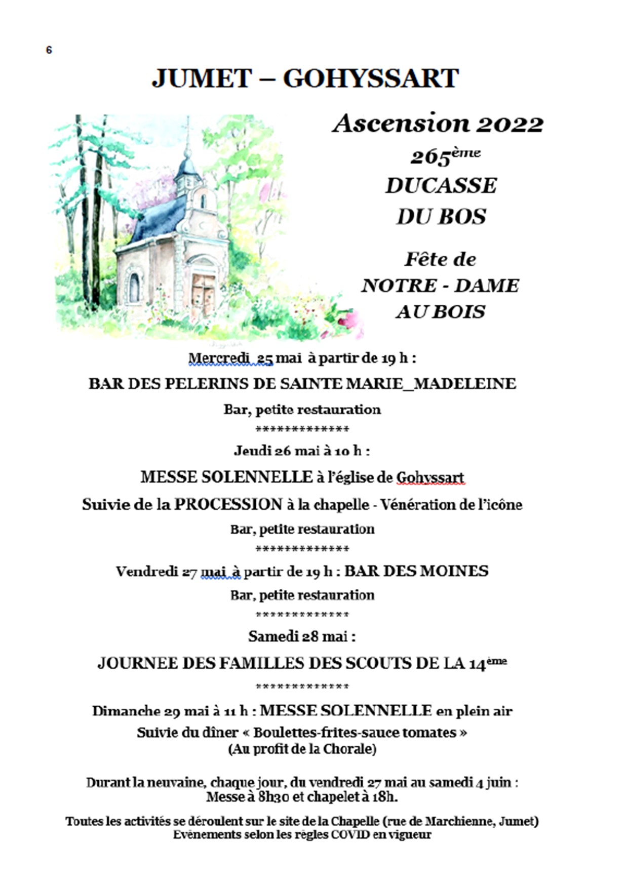 « Tous les ÉvènementsCet évènement est passé.Messe solennelle en plein air suivi du repas Fête de N-D Au Bois29 mai 2022 de 10 h 00 min à 22 h 00 min « Neuvaine à Notre Dame Au Bois 8h30 messe / 18h chapelet Des murs ou des ponts avec VE/EF » Ajouter au calendrier Google Agenda iCalendar Outlook 365 Outlook Live Détails Date : 29 mai 2022 Heure : 10 h 00 min à 22 h 00 min Lieu Chapelle Notre Dame au Bois rue de Marchienne Jumet,Hainaut6040Belgique+ Google Map