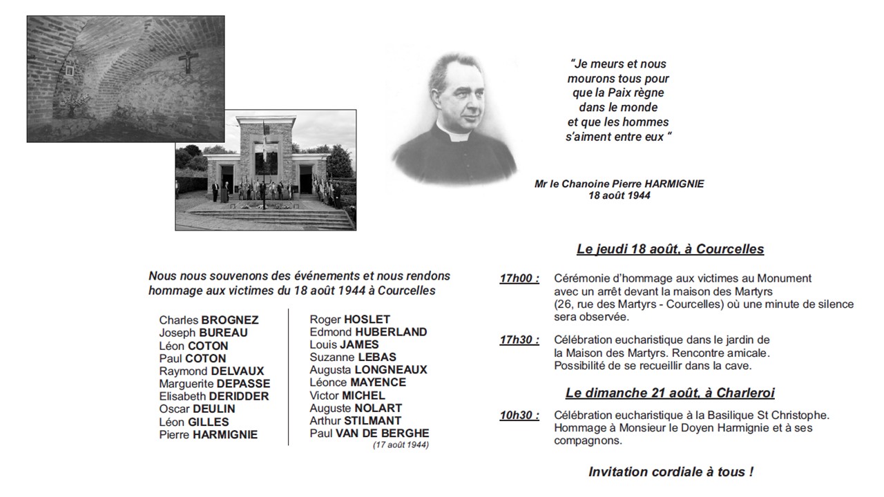 « Tous les ÉvènementsCet évènement est passé.Célébration eucharistique en hommage aux martyres de la tuerie du Rognac21 août 2022 de 10 h 30 min à 12 h 00 min « Commémoration de la tuerie du Rognac Matinée découverte à Dampremy » Ajouter au calendrier Google Agenda iCalendar Outlook 365 Outlook Live Détails Date : 21 août 2022 Heure : 10 h 30 min à 12 h 00 min Lieu Basilique Saint Christophe place du Manège Charleroi,Hainaut6000Belgique+ Google Map