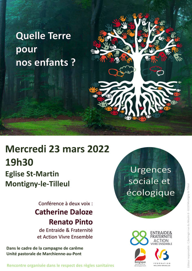 « Tous les ÉvènementsCet évènement est passé.Conférence : Quelle terre pour nos enfants?23 mars 2022 de 19 h 30 min à 21 h 30 min « conférence-débat « Le Monopoly des terres agricoles » Conférence de carême : les arbres qui marchent » Ajouter au calendrier Google Agenda iCalendar Outlook 365 Outlook Live Détails Date : 23 mars 2022 Heure : 19 h 30 min à 21 h 30 min Lieu Eglise Saint Martin Montignies le Tilleul