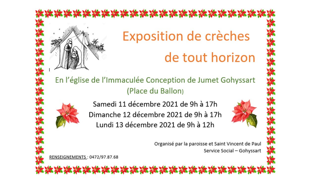 « Tous les ÉvènementsCet évènement est passé.Exposition de crèches ANNULEE13 décembre 2021 de 9 h 00 min à 12 h 00 min « Exposition de crèches ANNULEE Marché de Noël ANNULE » Ajouter au calendrier Google Agenda iCalendar Outlook 365 Outlook Live Détails Date : 13 décembre 2021 Heure : 9 h 00 min à 12 h 00 min Lieu Eglise de Gohyssart Place du Ballon Jumet Gohyssart,Hainaut6040Belgique+ Google Map