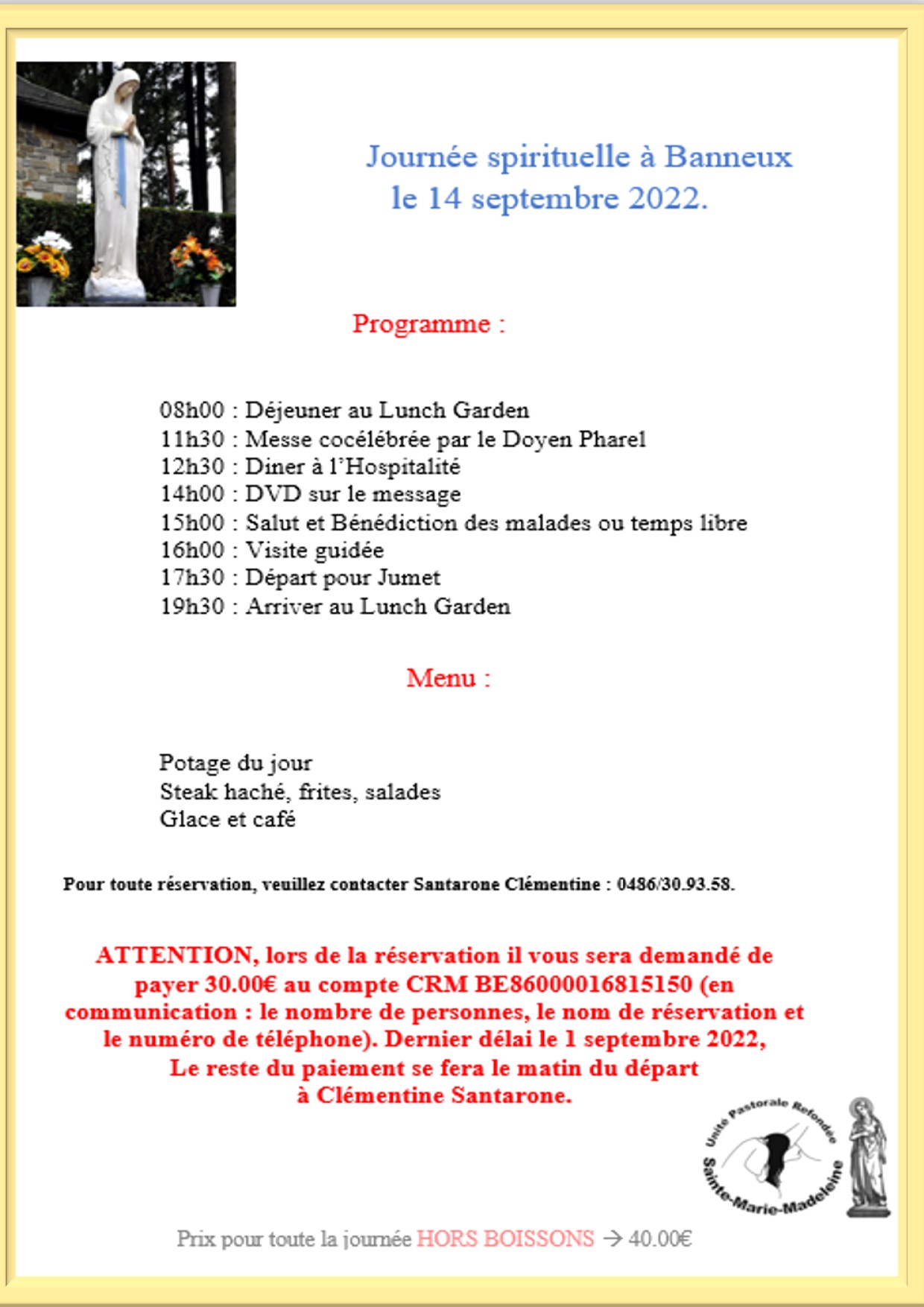 « Tous les ÉvènementsCet évènement est passé.Journée spirituelle à Banneux14 septembre 2022 « Soirée Arc En Terres : « un pouvoir d’achat en baisse, au risque de la survie » Répétition chorale pour la messe de rentrée » Ajouter au calendrier Google Agenda iCalendar Outlook 365 Outlook Live Détails Date : 14 septembre 2022 Lieu Banneux
