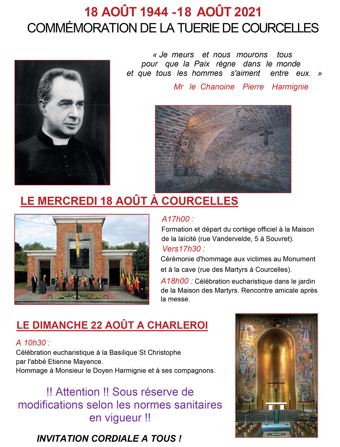 « Tous les ÉvènementsCet évènement est passé.Messe en l’honneur du Doyen Harmignie et ses compagnons22 août 2021 de 10 h 30 min à 12 h 00 min « Tour de la Madeleine 2021 Inscription catéchèse de cheminement à Dampremy » Ajouter au calendrier Google Agenda iCalendar Outlook 365 Outlook Live Détails Date : 22 août 2021 Heure : 10 h 30 min à 12 h 00 min Organisateur Région Pastorale de Charleroi Lieu Basilique Saint Christophe place du Manège Charleroi,Hainaut6000Belgique+ Google Map