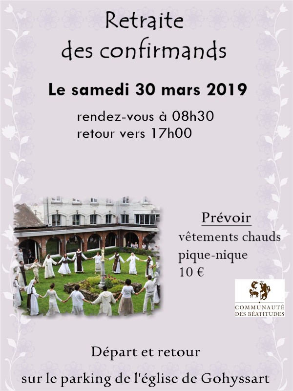 « Tous les ÉvènementsCet évènement est passé.Retraite des confirmands30 mars 2019 de 8 h 30 min à 17 h 00 min « ANNULE Conférence : Droits humains et enseignement social de l’église : une histoire à construire Messe des rameaux à Roux Bassée »Rendez-vous sur le parking de l’église de Gohyssart à 8h30 Ajouter au calendrier Google Agenda iCalendar Outlook 365 Outlook Live Détails Date : 30 mars 2019 Heure : 8 h 30 min à 17 h 00 min Organisateur Equipe de cheminement caté Lieu Communauté des Béattitudes