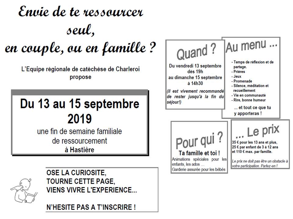 « Tous les ÉvènementsCet évènement est passé.Retraite en famille proposée par l’Équipe régionale de catéchèse13 septembre 2019 à 15 septembre 2019 « Réunion de l’Équipe d’Animation Locale clocher de Roux Journée diocésaine catéchèse, catéchuménat et liturgie » Ajouter au calendrier Google Agenda iCalendar Outlook 365 Outlook Live Détails Début : 13 septembre 2019 Fin : 15 septembre 2019 Organisateur Equipe régionale de catéchèse Lieu Hastière Hastière,Namur5540Belgique+ Google Map