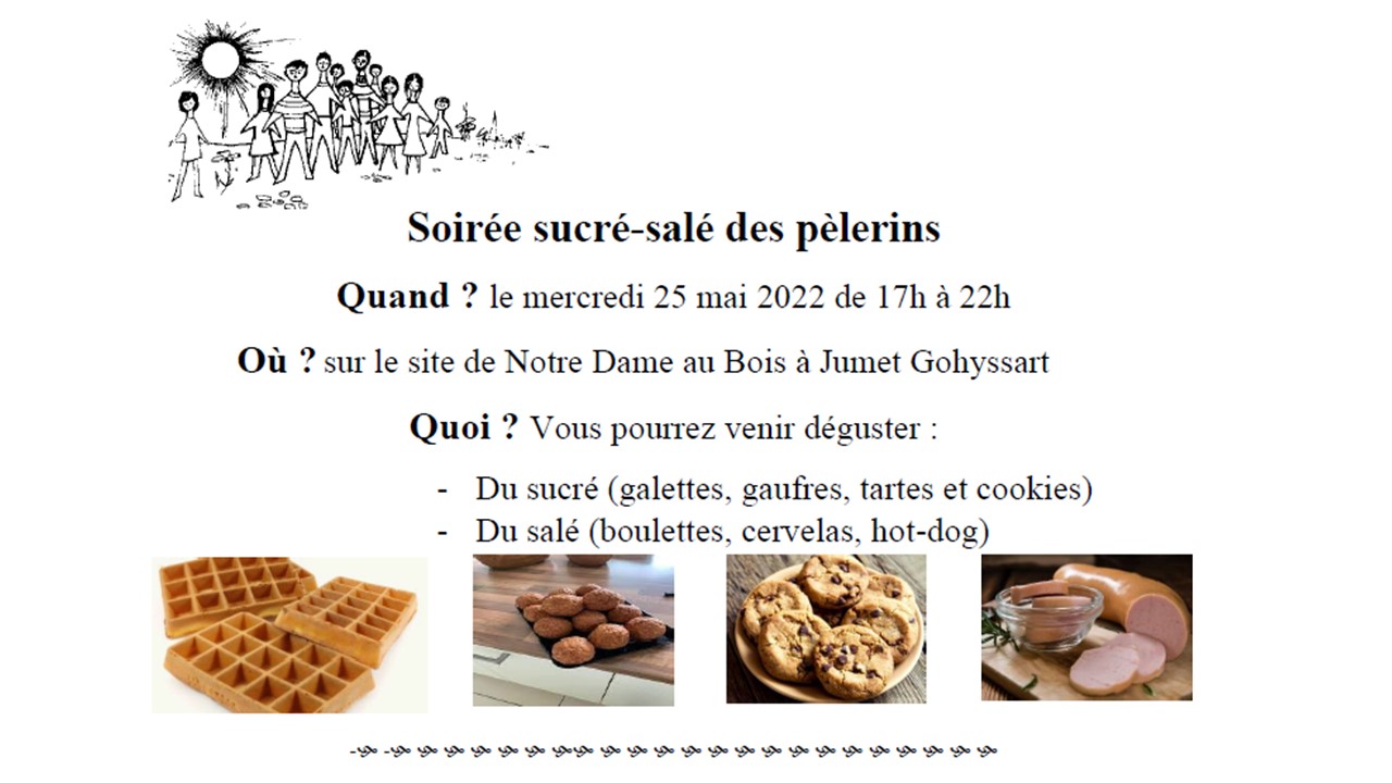« Tous les ÉvènementsCet évènement est passé.Soirée sucré salé des pèlerins à la fête de Notre Dame Au Bois25 mai 2022 de 17 h 30 min à 23 h 00 min « Migrants d’hier et d’aujourd’hui Messe solennelle suivie de la procession à Notre Dame Au Bois » Ajouter au calendrier Google Agenda iCalendar Outlook 365 Outlook Live Détails Date : 25 mai 2022 Heure : 17 h 30 min à 23 h 00 min Lieu chapelle Notre Dame au Bois rue de Marchienne Jumet,Hainaut6040Belgique+ Google Map